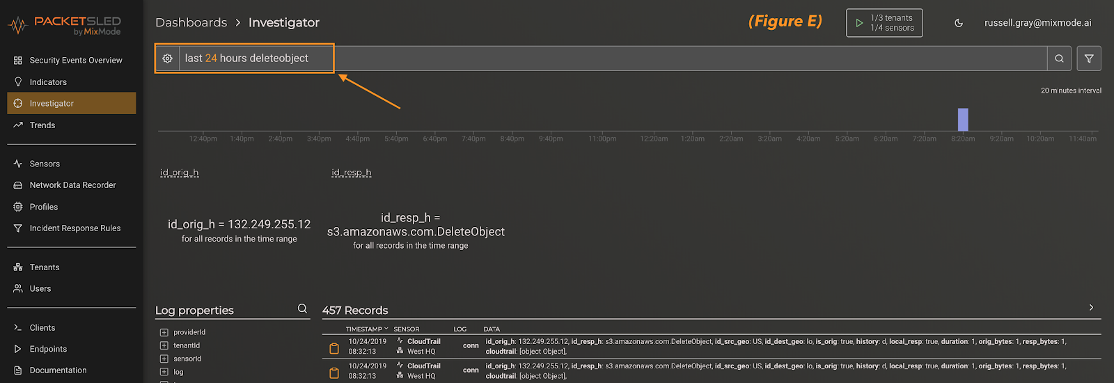 Once we pivot to MixMode investigator we have access to all of the CloudTrail log details and fields (figure D). As full forensic platform, MixMode provides the depth and breadth of details needed for you to investigate events surfaced by the AI. In this instance, once we have analyzed the anomalous log we are presented with a number of options to continue our investigating by querying or pivoting off of the CloudTrail log details (figured d).